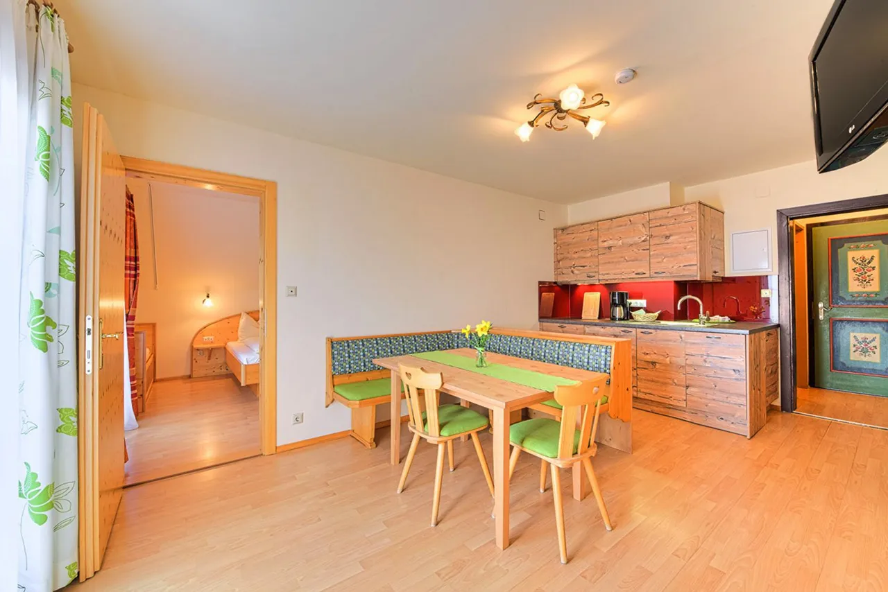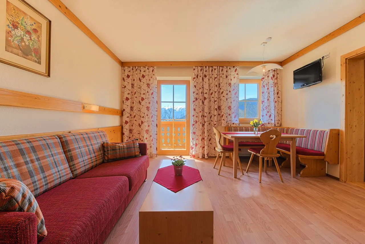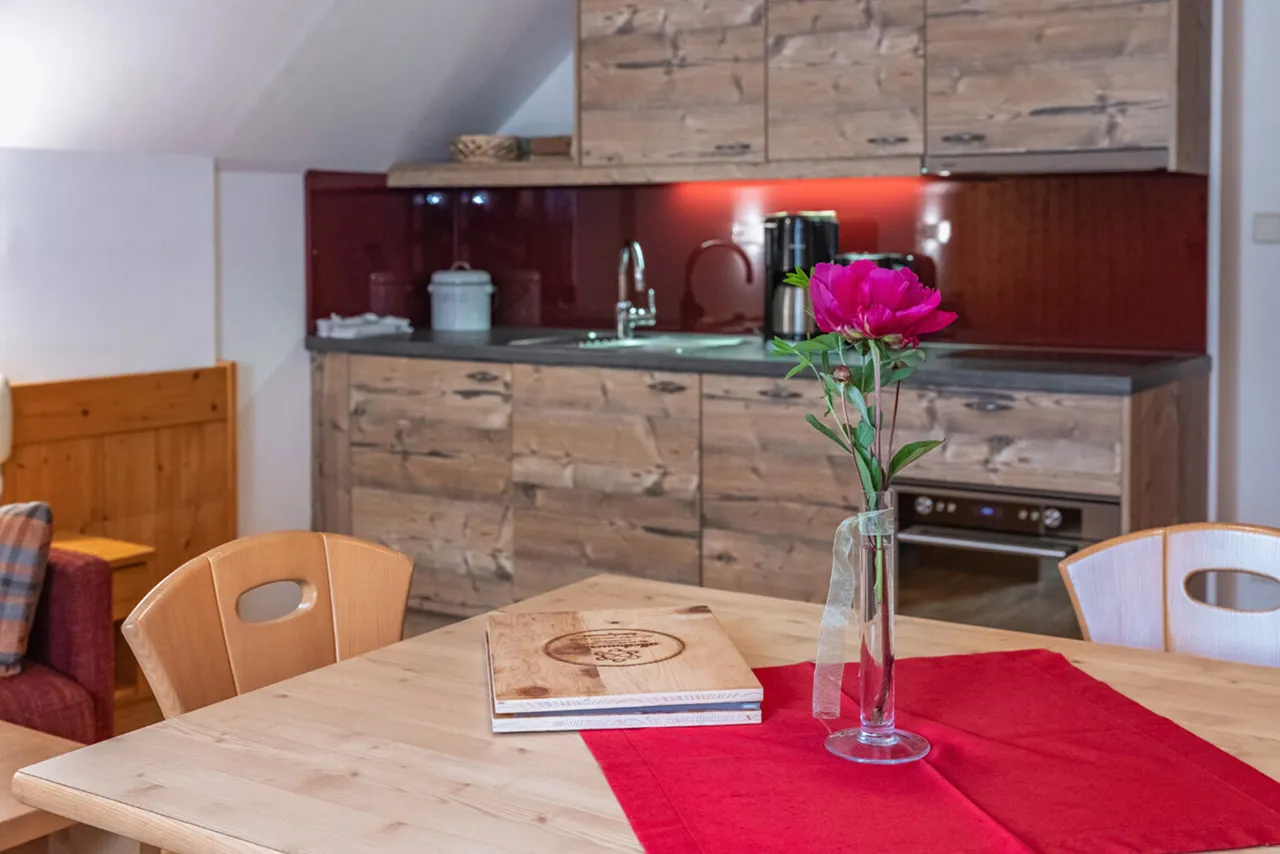 Každý apartmán je zařízen s důrazem na kvalitu, pohodlí a přirozené materiály. Nábytek z masivního dřeva ručně vyrobený mistrem tesařem dodává interiéru teplo a útulnost. Součástí je plně vybavená kuchyň, prostorný obývací pokoj i moderní vybavení včetně satelitní televize a Wi-Fi připojení. Každý apartmán navíc skrývá vlastní infračervenou kabinu, která promění každý večer v osobní wellness zážitek. Snídaňový košík s čerstvými produkty z farmy si mohou hosté objednat přímo do apartmánu – ideální začátek dne v rytmu alpské přírody.