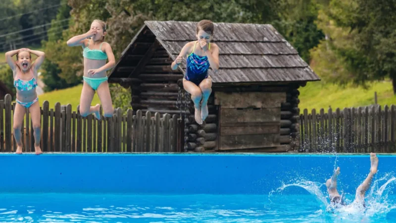 Oplocený areál nabízí dostatek lehátků a slunečníků k odpočinku a nádherný výhled na hory, který doplňuje pohodová atmosféra letního dne. Zatímco se děti cákají ve vodě nebo užívají jízdu na ponících, dospělí si mohou vychutnat slunce, klid a kouzlo života na farmě.