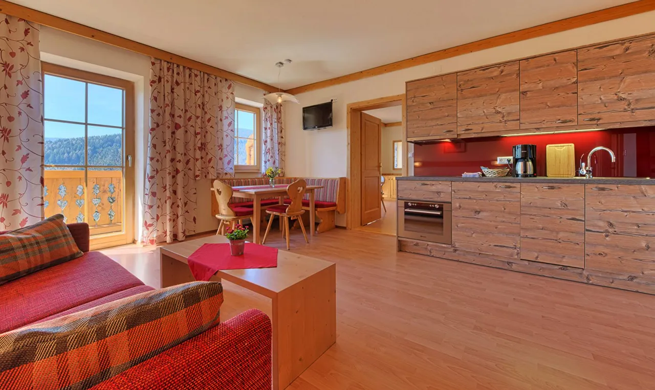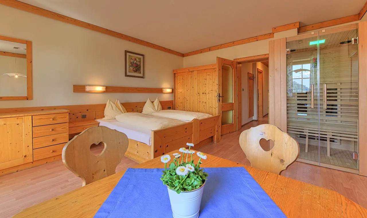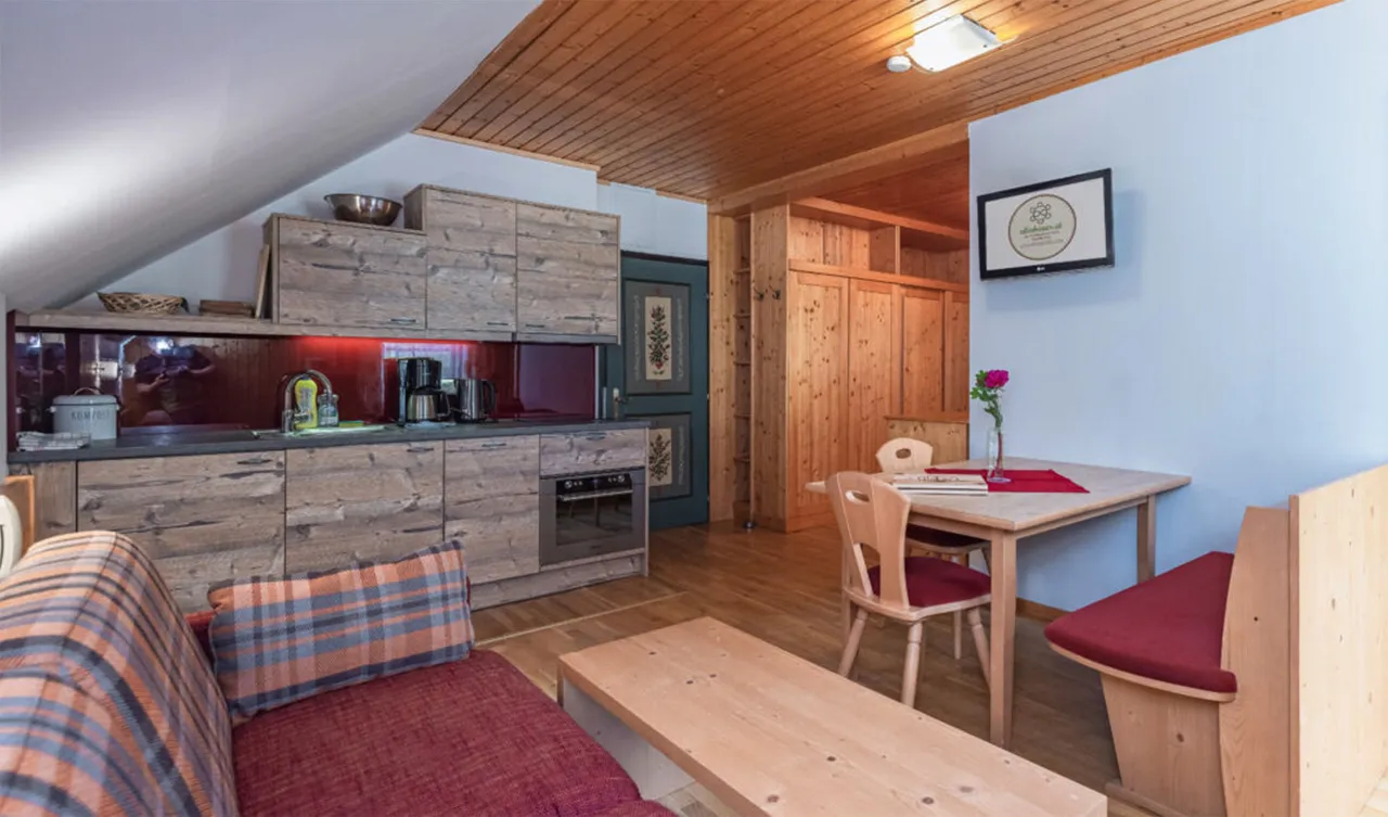 Každý apartmán je zařízen s důrazem na kvalitu, pohodlí a přirozené materiály. Nábytek z masivního dřeva ručně vyrobený mistrem tesařem dodává interiéru teplo a útulnost. Součástí je plně vybavená kuchyň, prostorný obývací pokoj i moderní vybavení včetně satelitní televize a Wi-Fi připojení. Každý apartmán navíc skrývá vlastní infračervenou kabinu, která promění každý večer v osobní wellness zážitek. Snídaňový košík s čerstvými produkty z farmy si mohou hosté objednat přímo do apartmánu – ideální začátek dne v rytmu alpské přírody.