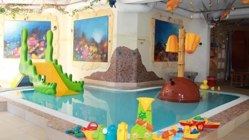 Dětský bazén je určen pro miminka a batolata. S hloubkou pouhých 20 cm a příjemně vyhřátou vodou o teplotě 32 °C představuje bezpečné prostředí, kde si mohou nejmenší hosté užívat radost ze hry ve vodě.