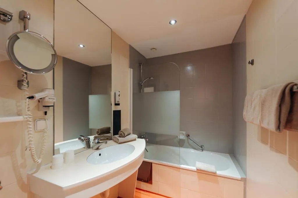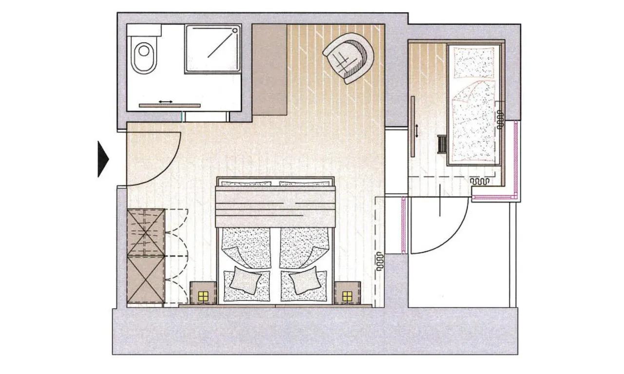 Součástí je balkon s výhledem na okolní hory nebo klidný dvůr, který vybízí k odpočinku. Nechybí moderní koupelna, funkční vybavení ani prvky zaměřené na rodiny, jako je přebalovací pult nebo bezpečnostní prvky pro děti.