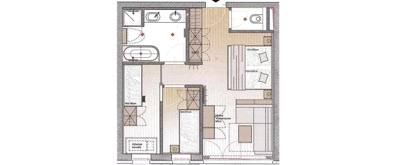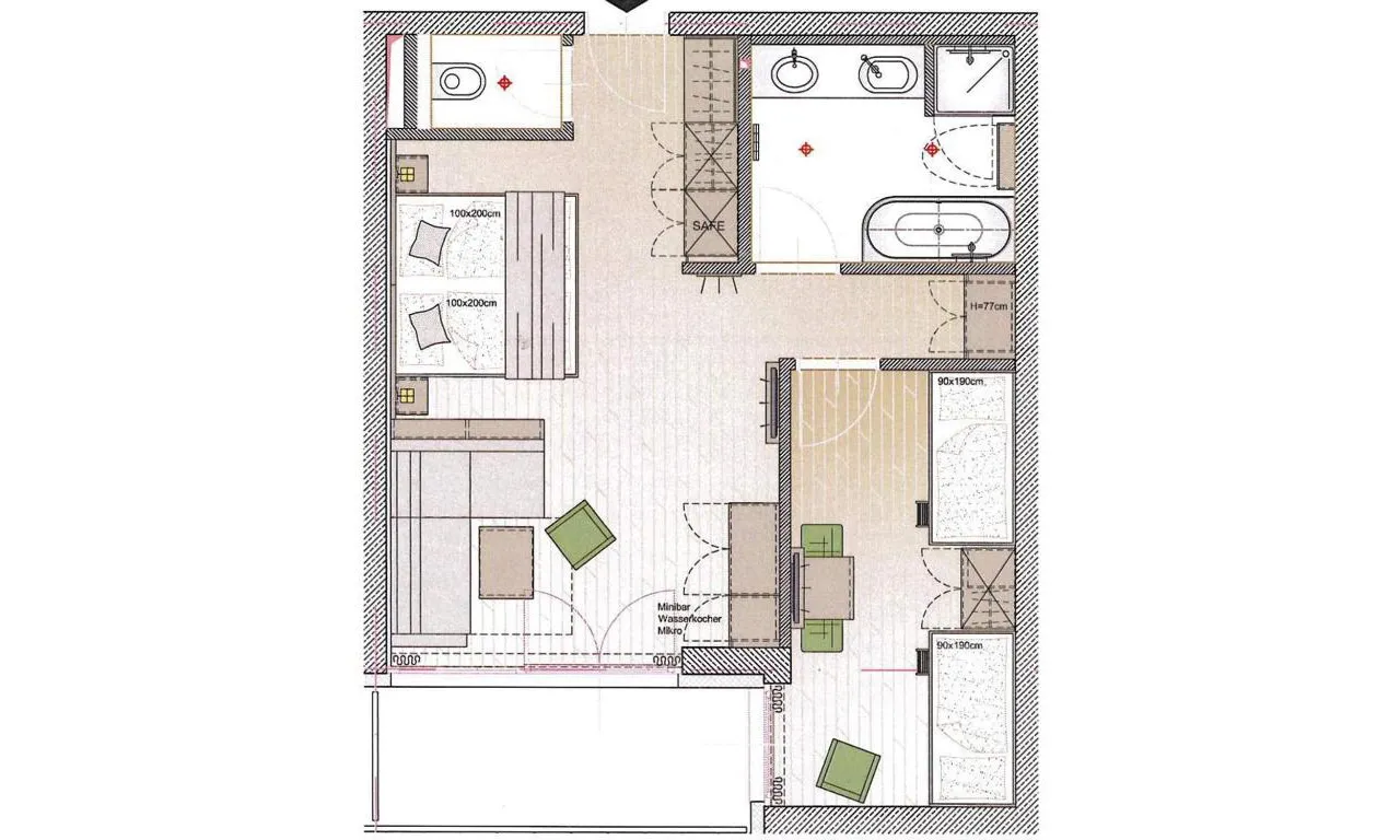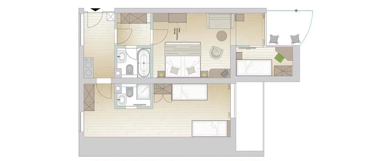 Stylové apartmá o velikosti cca 50 m² je ideální pro 3–6 osob a nabízí pohodlné zázemí pro rodiny i menší skupiny. Díky dvěma až třem samostatným ložnicím a promyšlenému uspořádání poskytuje dostatek prostoru pro odpočinek i společně strávený čas.