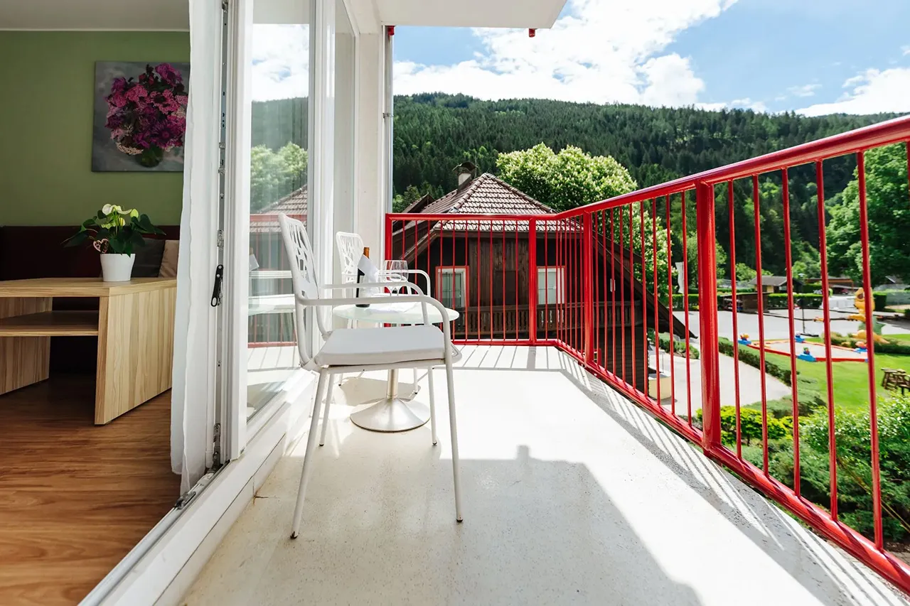 Součástí apartmá je balkon s výhledem na okolní hory, který potěší všechny milovníky přírody. Nechybí ani praktické rodinné vybavení, jako je dětská vanička nebo přebalovací pult, díky kterým si pobyt užijí i rodiny s malými dětmi.