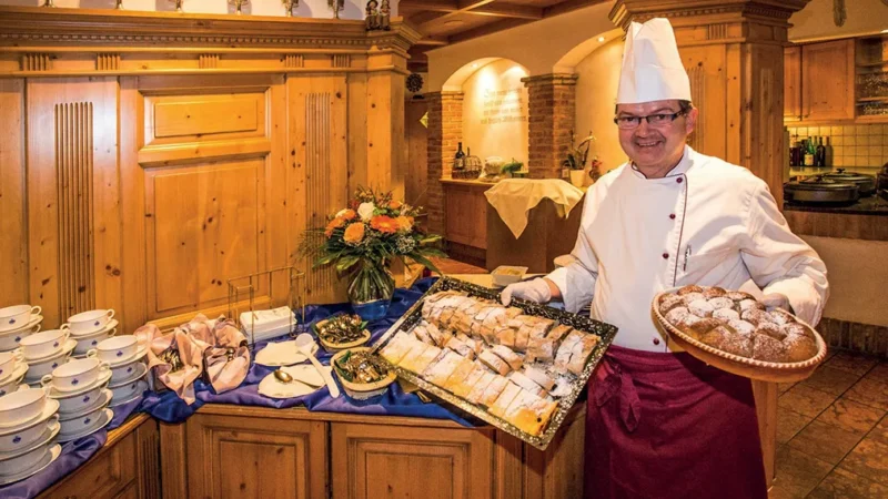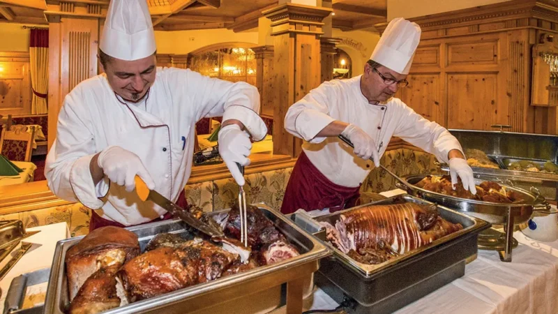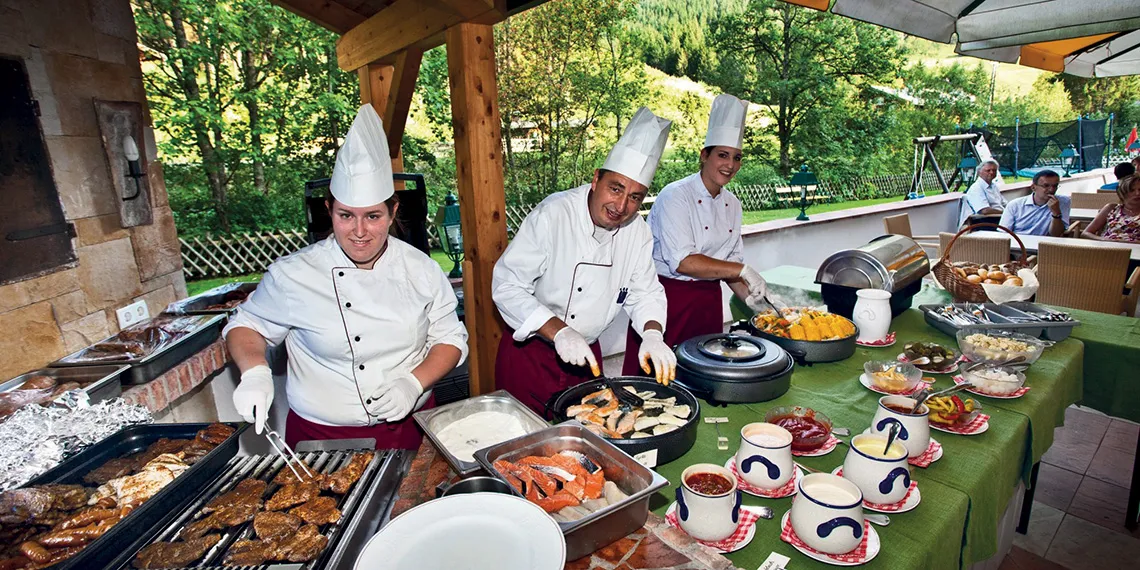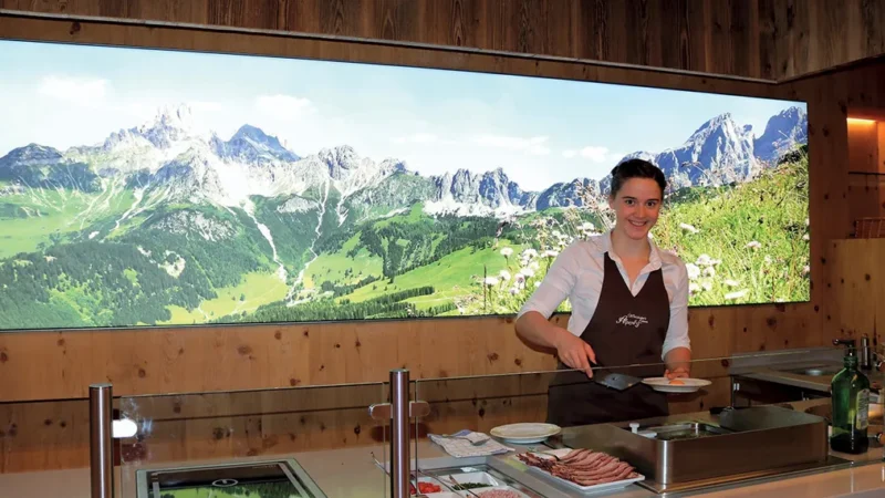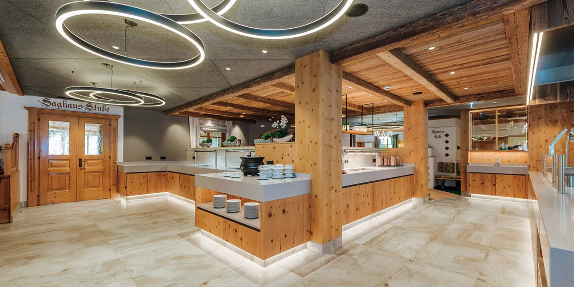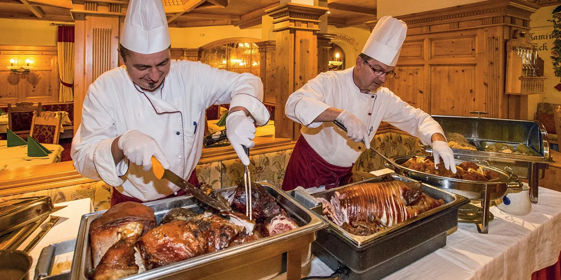 Hosté hotelu Alpenhof si užijí autentickou rakouskou kuchyni i mezinárodní speciality, připravované zkušeným kuchařským týmem. Hotel nabízí bohatou snídani formou bufetu, která poskytuje energii na celý den, a večerní menu pro hosty s polopenzí. Večeře zahrnuje výběr ze dvou čtyřchodových menu a doplňuje ji pestrý salátový bufet.