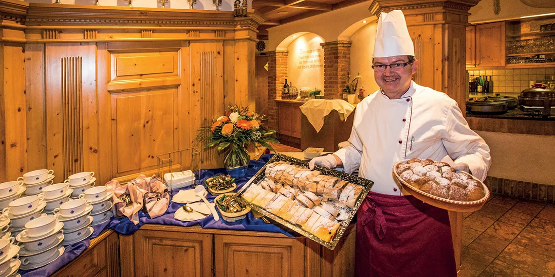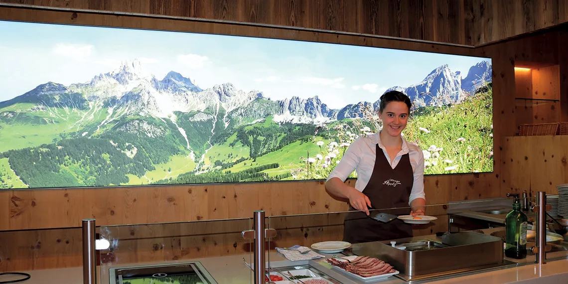 Hosté si mohou dopřát bohatý snídaňový bufet plný čerstvých regionálních produktů od místních farmářů a denně pečeného chleba a pečiva z pekárny Sieberer ve Filzmoosu. Obsluhující tým připravuje přímo před hosty pokrmy jako vejce Benedikt či míchaná vejce – ideální start pro den plný aktivit.