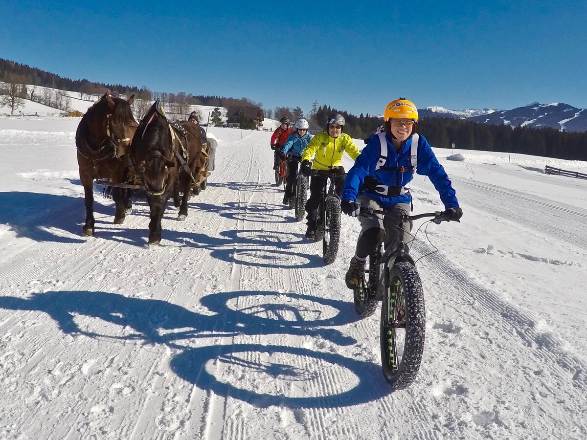 Ve Schladming-Dachstein se stále více prosazuje zimní trend – fatbiking. Díky extra širokým plášťům o tloušťce až 12 cm jsou kola navržená tak, aby snadno projela sněhem i v náročnějších podmínkách. Tento sport pochází z Aljašky a dnes láká začátečníky i zkušené cyklisty.
