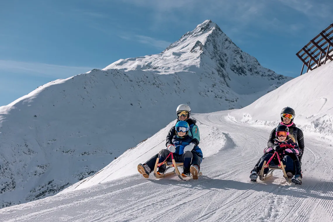 Sníh, smích a rychlý sjezd dolů do údolí – tak vypadá rodinné sáňkování v Ötztalu.