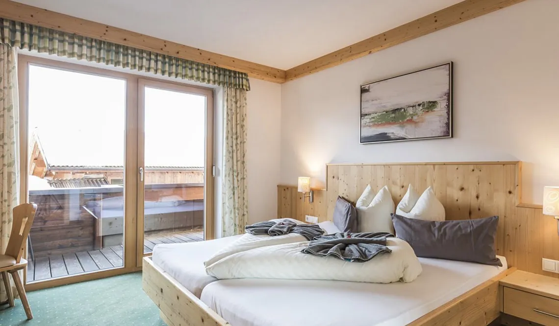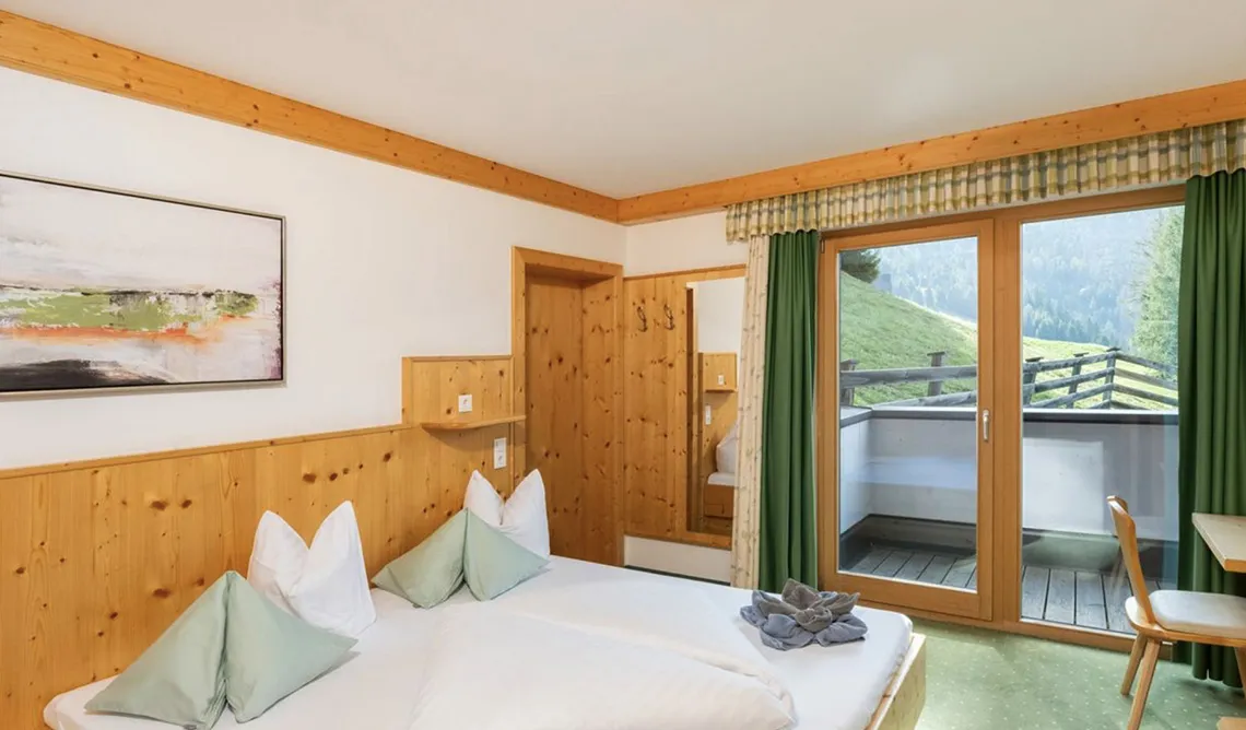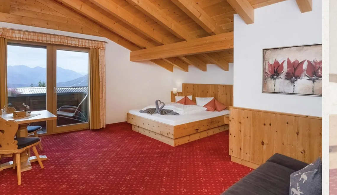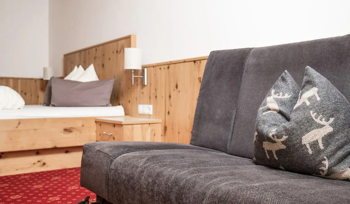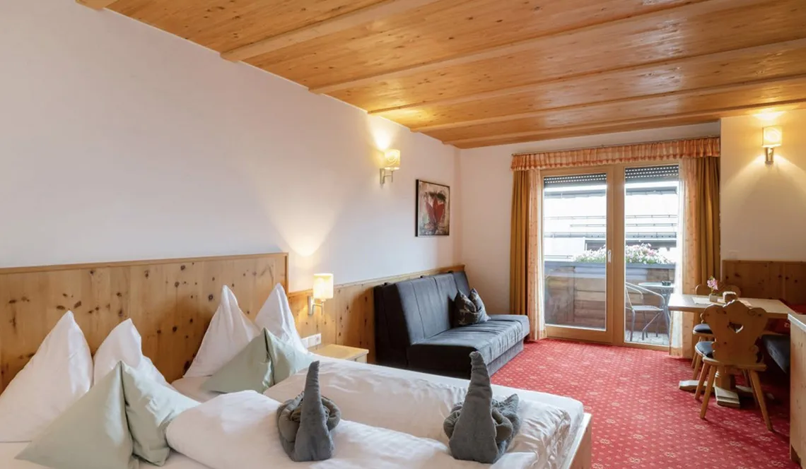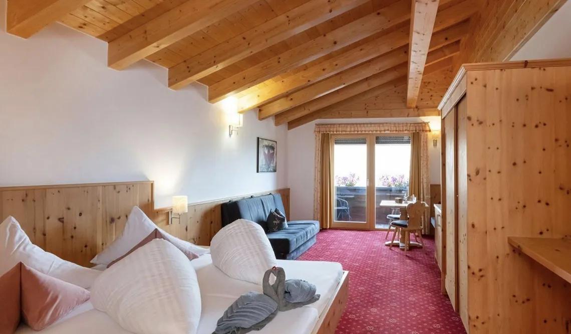 Familienzimmer nabízí cca 30 m² prostoru a pohodlí pro 3–6 osob, ideální pro rodiny s dětmi nebo skupiny přátel. Kombinace manželské postele a dvou paland zajišťuje dostatek místa pro všechny, zatímco útulná atmosféra zve ke společným zážitkům a odpočinku. Některé pokoje disponují balkonem s výhledem na hory, který dotváří kouzlo rodinné dovolené v Pitztalu.