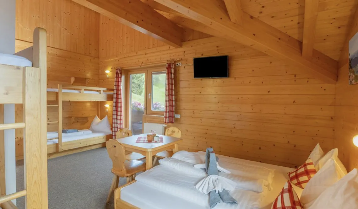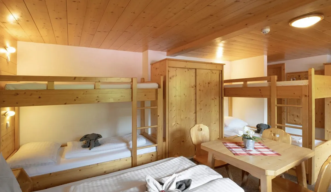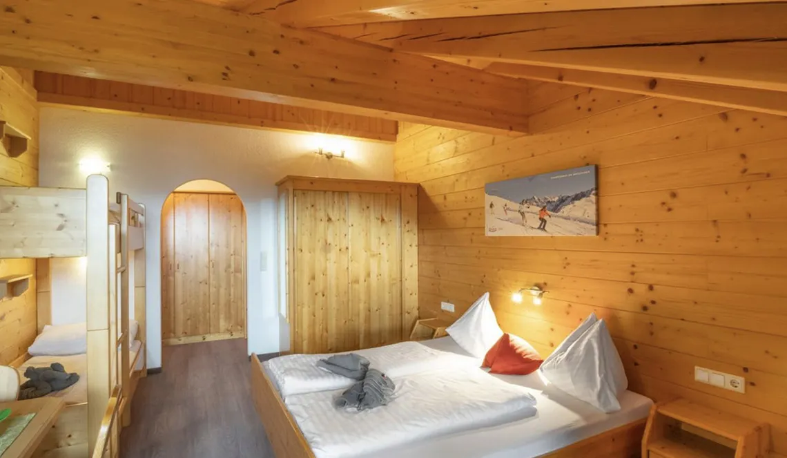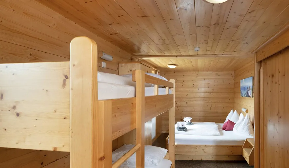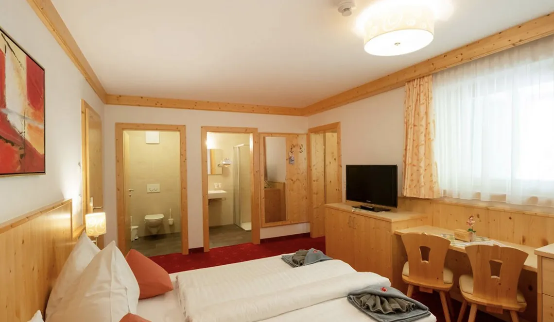 Rodinný pokoj s propojovacími dveřmi o rozloze cca 28 m² je ideální volbou pro 2–4 osoby, které chtějí zůstat blízko a zároveň mít trochu soukromí. Nabízí manželskou postel a oddělenou ložnici s palandami, což z něj dělá útulné místo pro rodiny s dětmi. Praktické vybavení a pohodová atmosféra doplňují pocit domova vysoko v horách Pitztalu.