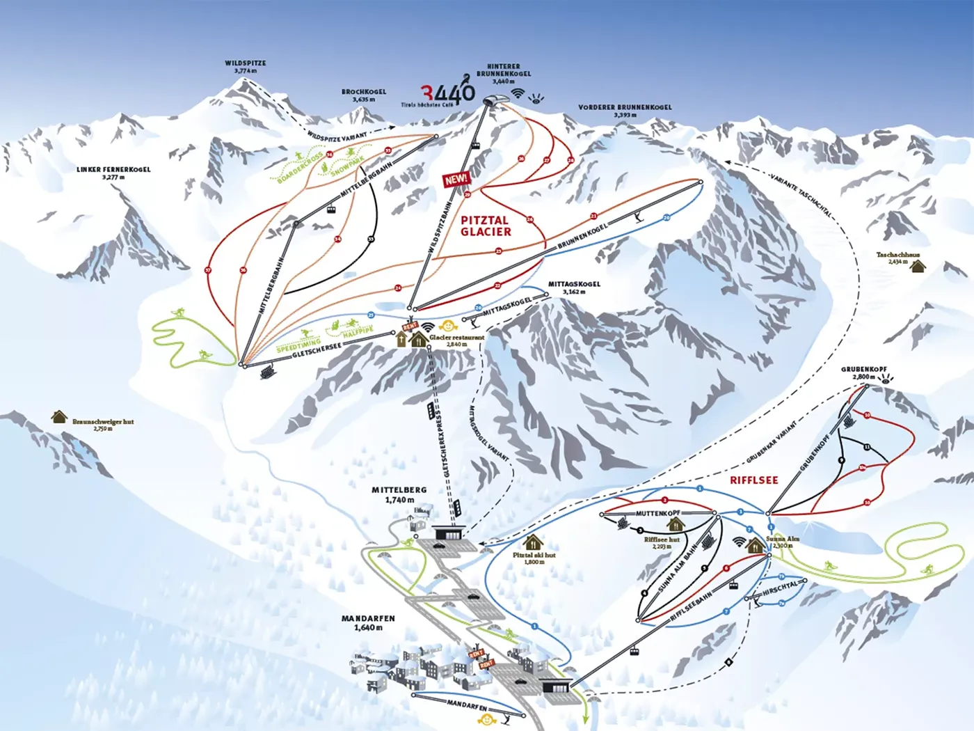 Lyžařský areál Rifflsee je s Pitztalským ledovcem propojen a nabízí dalších 18 km sjezdovek. Díky přehlednému terénu, cvičným vlekům a dětskému areálu v Mandarfenu je ideální volbou pro rodiny a začátečníky, zatímco sportovci ocení i červené a černé tratě.