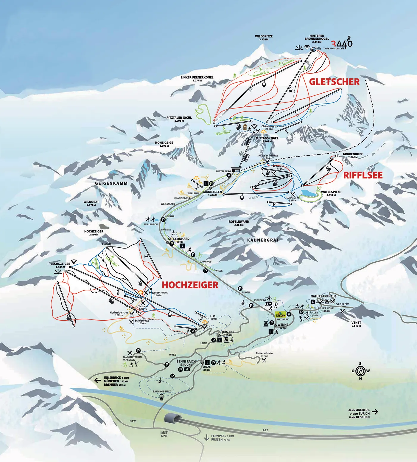 Pitztal nabízí hned tři areály, které zaručují rozmanité zážitky na svahu. Ledovec Pitztal s jistotou sněhu od září do května, útulný Rifflsee s rodinnou atmosférou a sluncem zalitý Hochzeiger s 54 km sjezdovek. Každý areál má svůj charakter, dohromady však tvoří jedinečný lyžařský ráj Tyrolska.