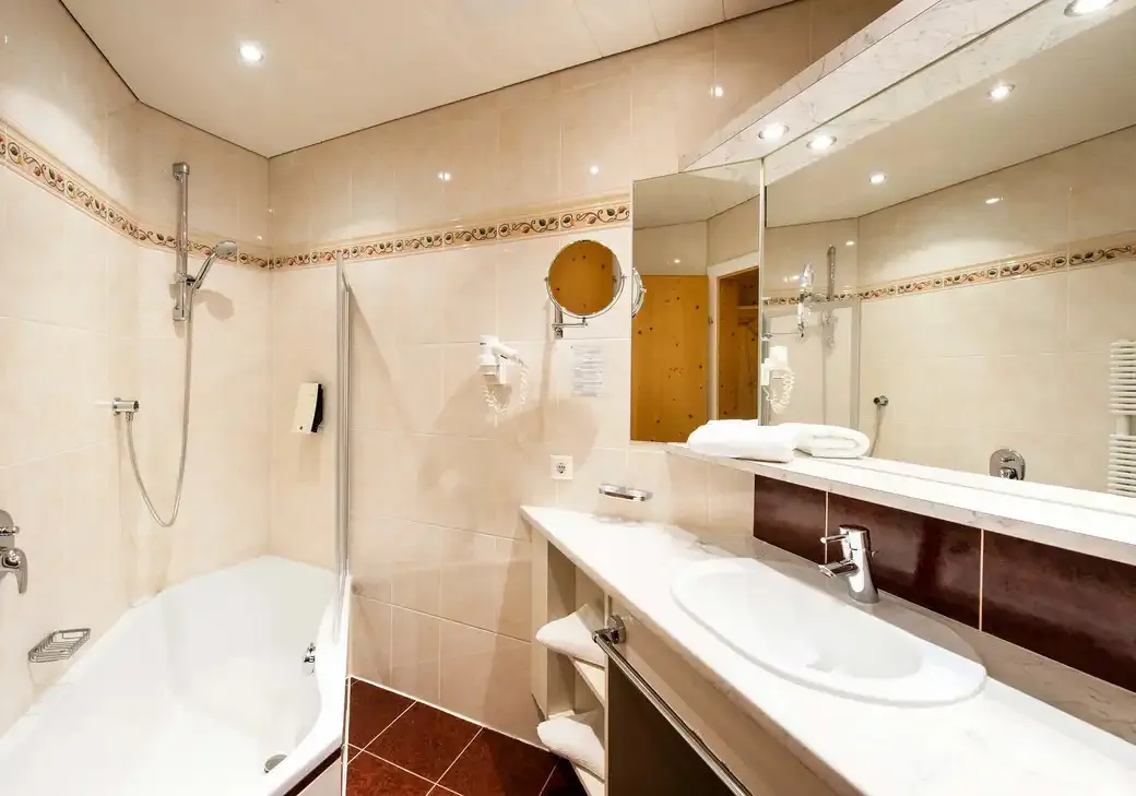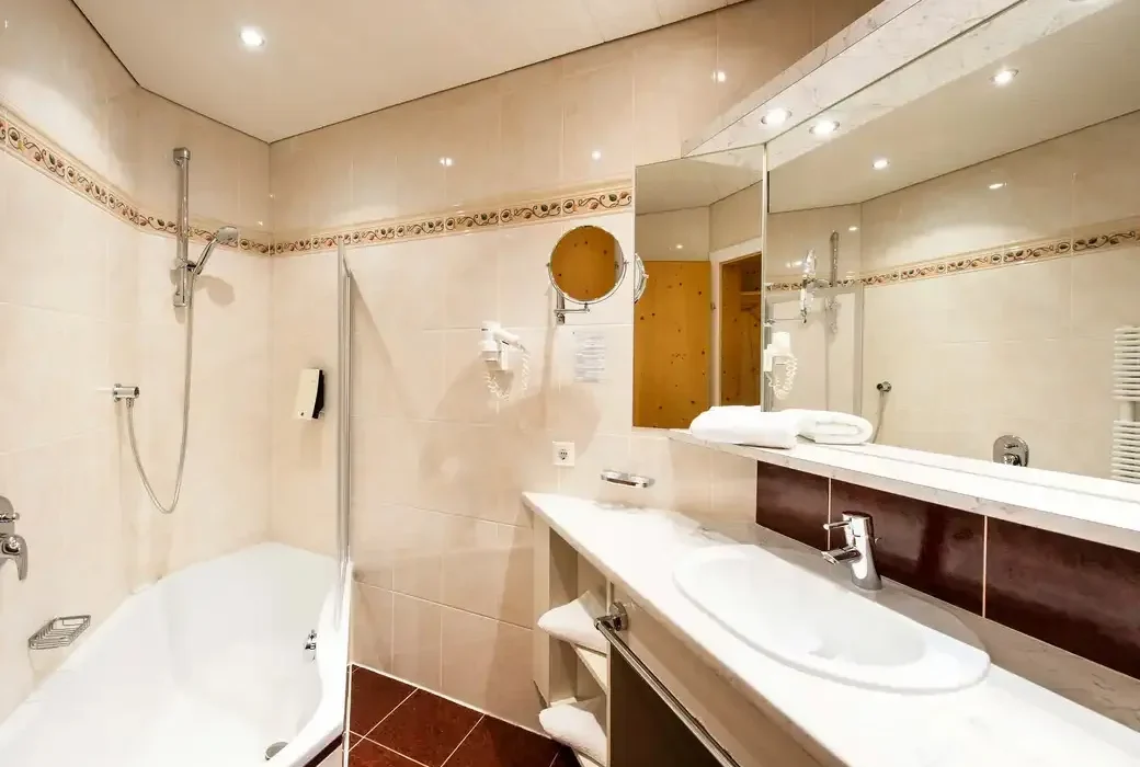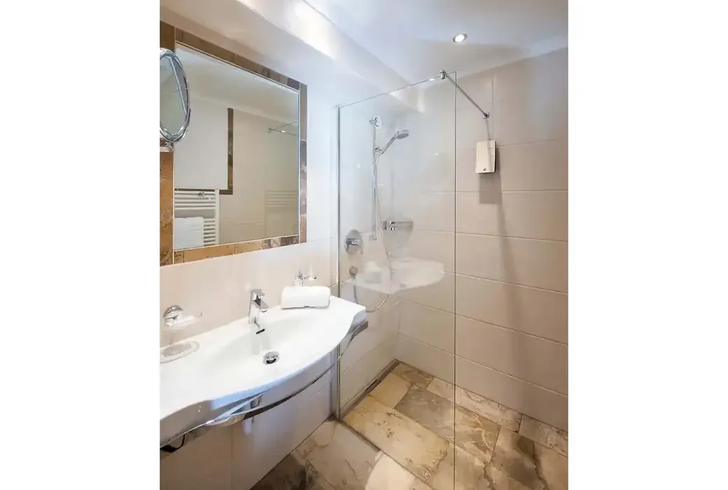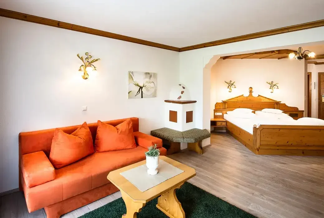 Apartmá Gletscher Suite přináší maximální komfort a úchvatné výhledy na ledovec. Součástí je obývací pokoj, samostatná toaleta, prostorná koupelna s vanou a autentická kachlová kamna. Slunný balkon orientovaný na jih nabízí nezapomenutelné panoramatické scenérie – ideální pro relaxaci po dni stráveném v horách.